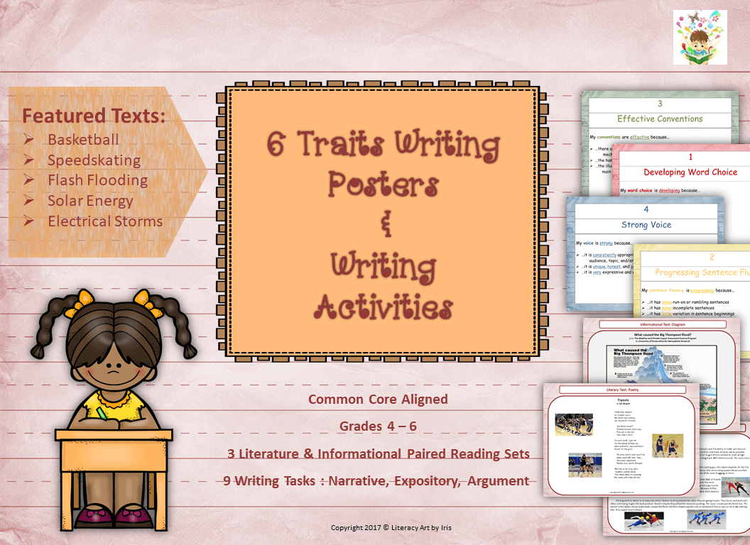 Teachers and parents, students can read literary and informational paired text and write a well-written essay that references the text they’ve read. An added plus are the 6 Traits of Writing posters or if your student or child needs easy access, the Six Traits of Writing Expandable Bookmarks are at their finger-tips.